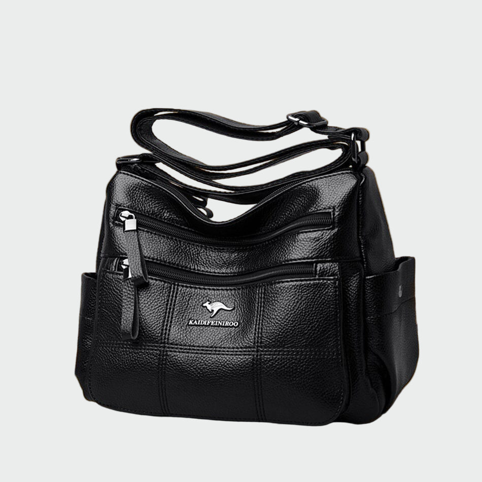 Πρακτική τσάντα ώμου σε μαύρη απόχρωση με κλασικό και λειτουργικό σχεδιασμό. Διαθέτει πολλαπλές εξωτερικές θήκες με φερμουάρ που προσφέρουν άνεση στην οργάνωση και άμεση πρόσβαση στα απαραίτητα. Το ανθεκτικό υλικό της και τα στιβαρά χερούλια εξασφαλίζουν καθημερινή αντοχή, ενώ ο μινιμαλιστικός χαρακτήρας της ταιριάζει με κάθε εμφάνιση. Μια ιδανική επιλογή για όσες αναζητούν στυλ και πρακτικότητα σε μία τσάντα.