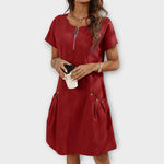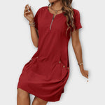 Ανανεώστε την καθημερινότητά σας με αυτό το μπορντό φόρεμα με κοντό μανίκι. Ο απλός και άνετος σχεδιασμός του προσφέρει στιλ χωρίς υπερβολές, ιδανικό για κάθε περίσταση.