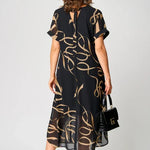 Ένα φόρεμα που συνδυάζει στυλ και άνεση, ιδανικό για γυναίκες που αγαπούν τη διαχρονική κομψότητα. Το μαύρο ύφασμα με τις χρυσές λεπτομέρειες δημιουργεί ένα εκλεπτυσμένο αποτέλεσμα που τραβάει τα βλέμματα σε κάθε περίσταση.