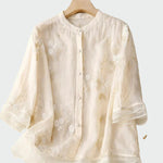 Η μπλούζα εκρού με διακριτικά λουλουδάτα κεντήματα είναι ένα κομψό και αέρινο κομμάτι που αποπνέει θηλυκότητα και απλότητα. Με κουμπιά στο μπροστινό μέρος και μανίκια 3/4, προσφέρει άνεση και στυλ για κάθε περίσταση.