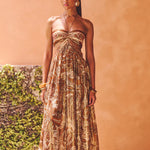 Εντυπωσιακό μάξι φόρεμα με πλούσιο παϊσλέ μοτίβο σε αποχρώσεις του χρυσού, του καφέ και του κεραμιδί. Το στράπλες μπούστο με εντυπωσιακή κοπή και κομψά ανοίγματα αναδεικνύει τη θηλυκότητα, ενώ η αέρινη φούστα χαρίζει κίνηση και κομψότητα. Ιδανικό για βραδινές εξόδους, κοκτέιλ πάρτι και καλοκαιρινές περιστάσεις που απαιτούν glam εμφάνιση.
