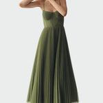 Ένα κομψό και θηλυκό φόρεμα με λεπτές τιράντες και εφαρμοστό μπούστο που τονίζει τη σιλουέτα. Η πλισέ φούστα σε midi μήκος χαρίζει μοναδική κίνηση και διαχρονική κομψότητα. Ιδανικό για κομψές εμφανίσεις, από γάμους μέχρι επίσημες εκδηλώσεις.