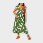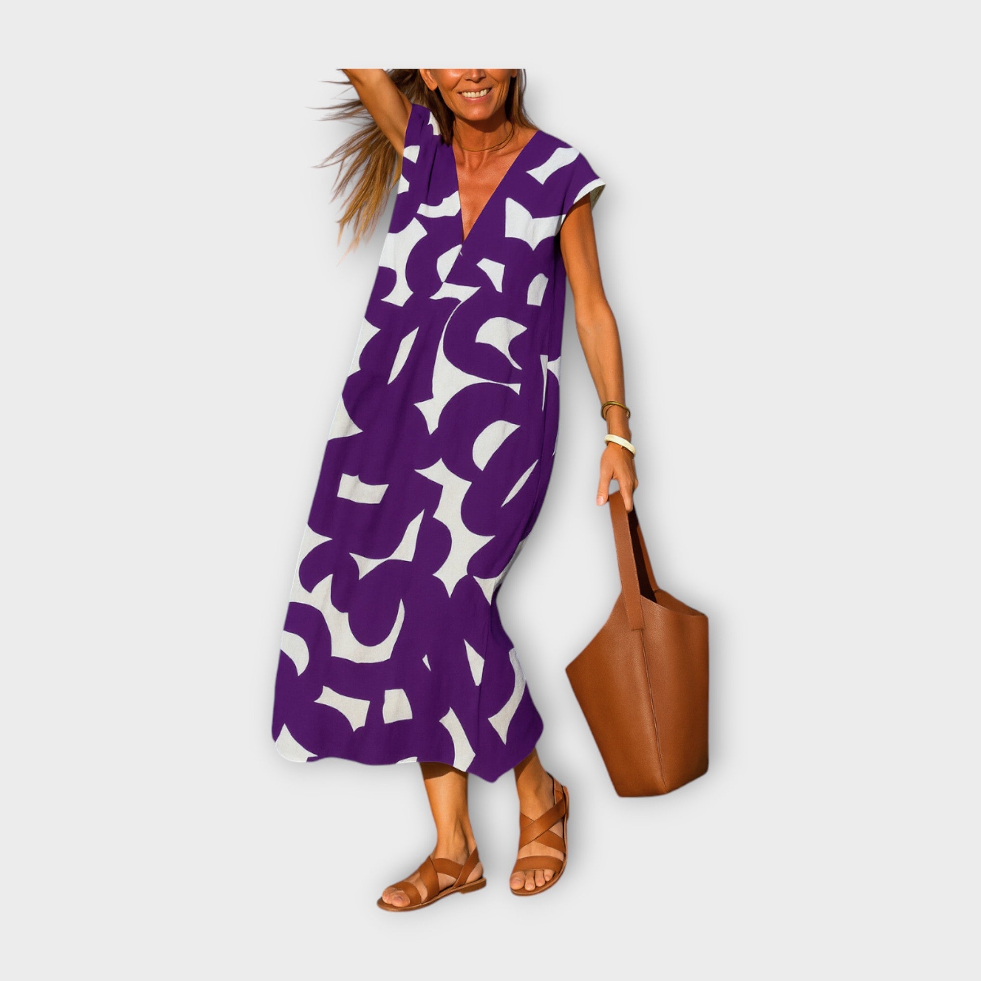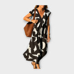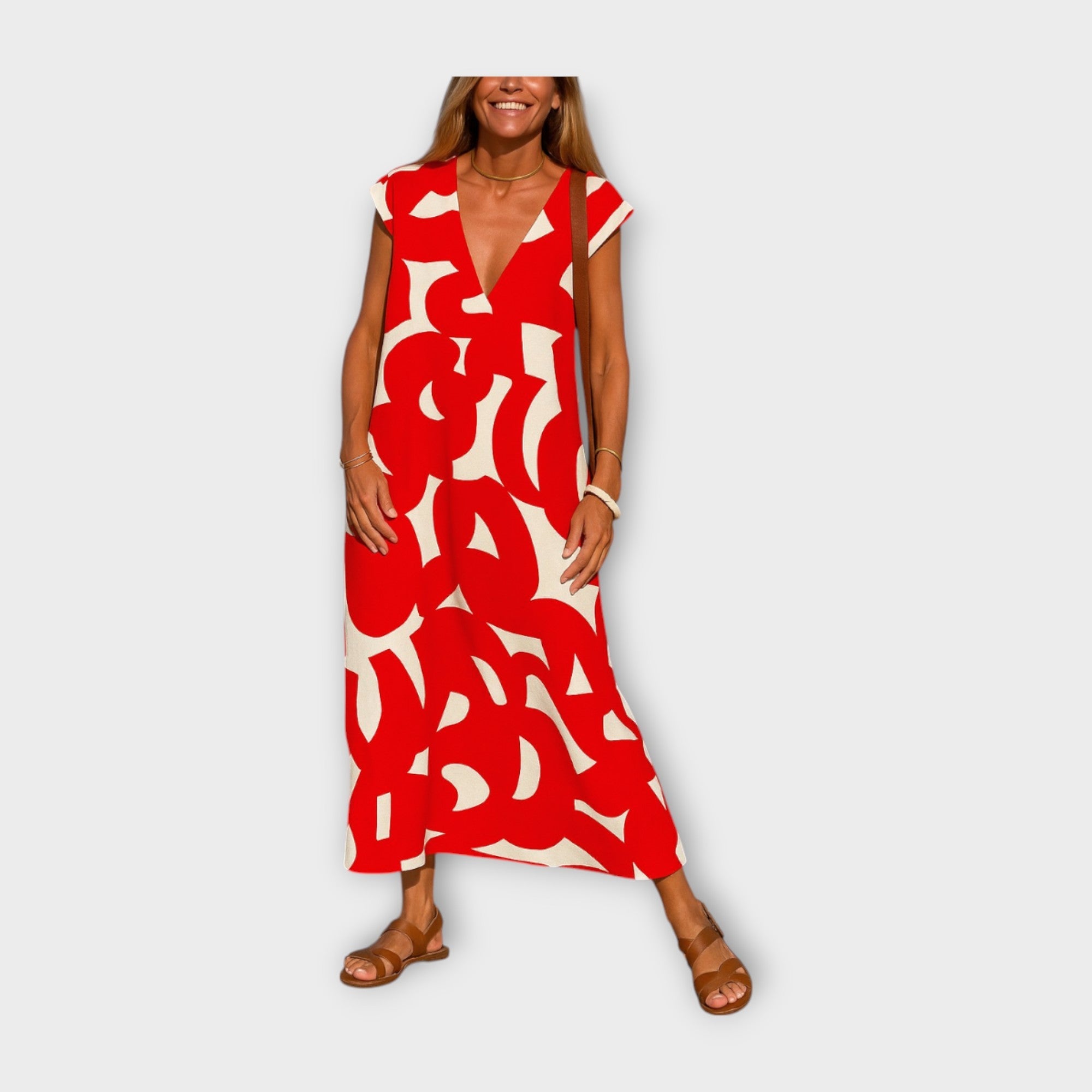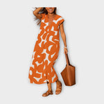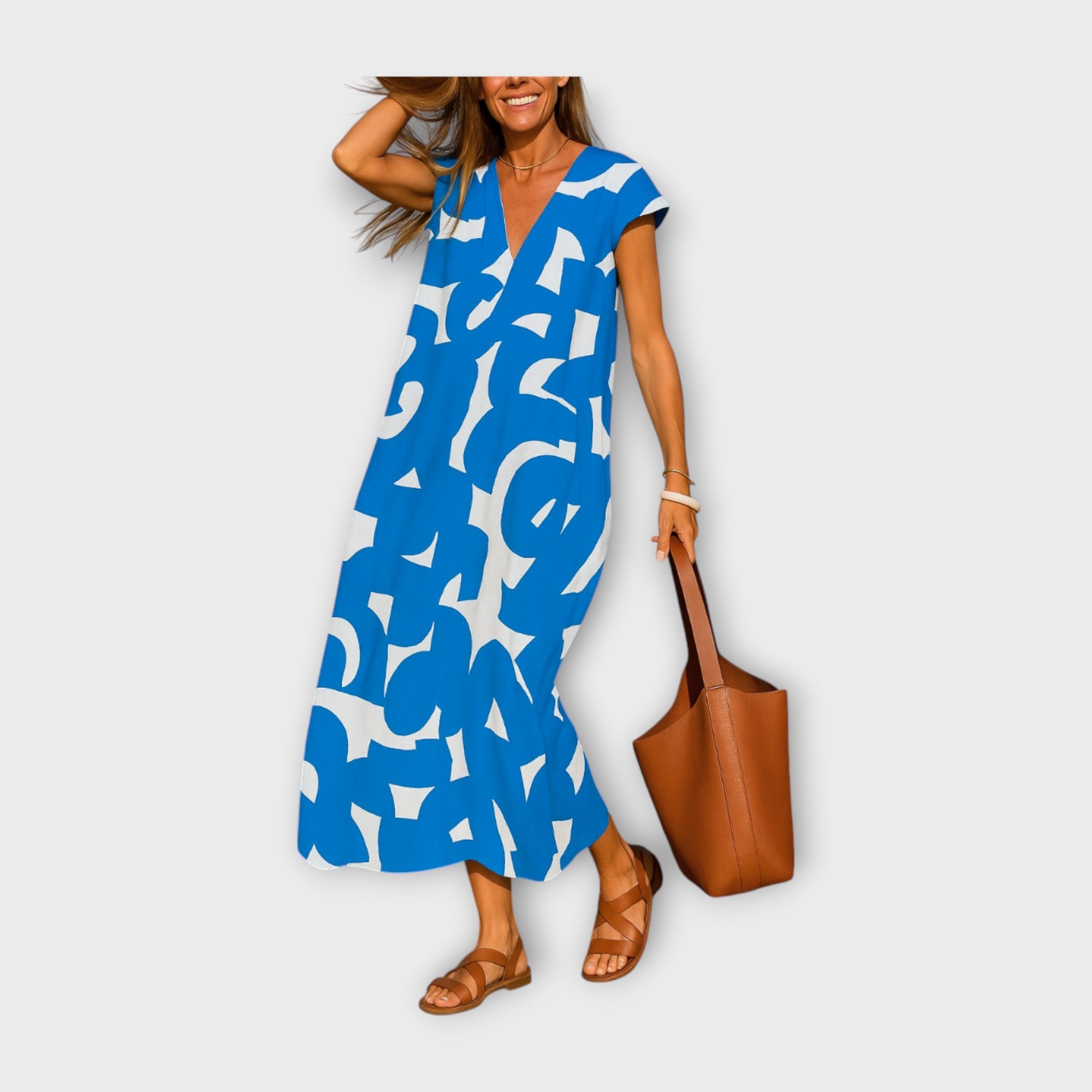 Ανακάλυψε την τέλεια ισορροπία ανάμεσα στην καλλιτεχνική κομψότητα και τη χαλαρή άνεση με αυτό το μακρύ φόρεμα διακοσμημένο με μοναδικό αφηρημένο μοτίβο. Ιδανικό για ζεστές καλοκαιρινές μέρες, προσφέρει δροσερή εφαρμογή και ξεχωριστό στυλ σε κάθε εμφάνιση.